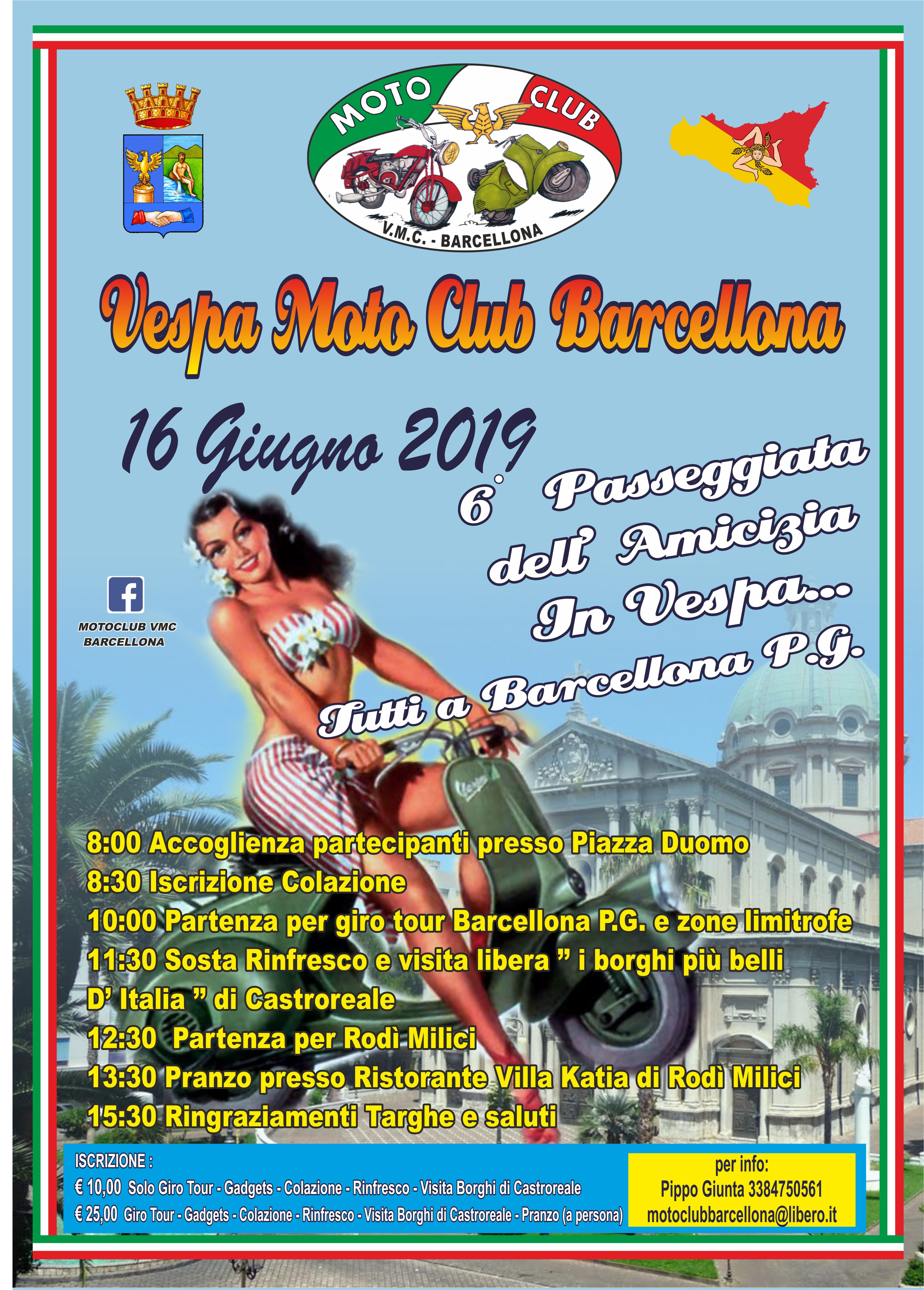 domenica 16 giugno 2019 si terrà la “6° Passeggiata dell’Amicizia in Vespa….tutti a Barcelona P.G.” organizzata dal Motoclub Vmc Barcellona, per trascorrere una fantastica giornata all’insegna del divertimento e della spensieratezza, quindi appuntamento a Piazza