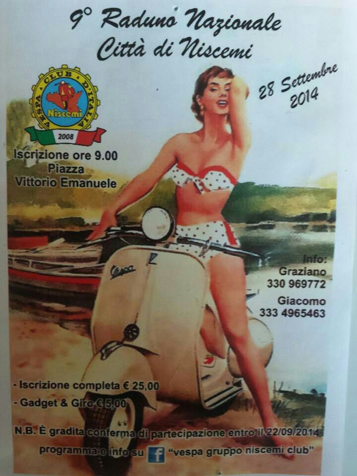 Vespisti e Associati,dopo i raduni nazionali di Pizzo e Monasterace, il Moto Club VespaClub Messina è pronto alla partecipazione del Raduno Nazionale Cittàdi Niscemi giunto alla 9° edizione!!!Appuntamento ore 6.15 in P.zza Cairoli, domenica...