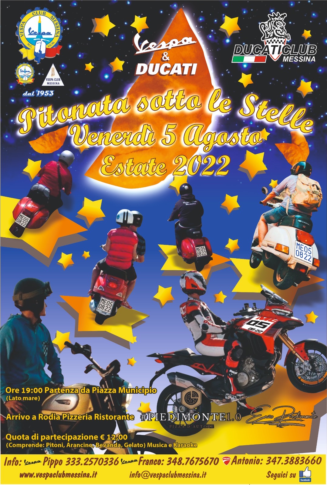 Cari amici, con immenso piacere vi comunico che dopo due anni di fermo, causa pandemia, quest’anno il Vespa Club Messina con il Ducati Club Messina come da tradizione faremo la classifica pitonata a Rodia. Appuntamento Venerdì 05 Agosto largo Minutoli (precisamente di fronte il municipio) ore 19:00 il tempo dell’iscrizione, e di qualche foto per ripartire alle ore 19:30 alla volta di Rodia al ristorante pizzeria “Enzo Piedimonte” dove ci è stata riservata tutta la piattaforma direttamente a mare. Per i costi vedi locandina.